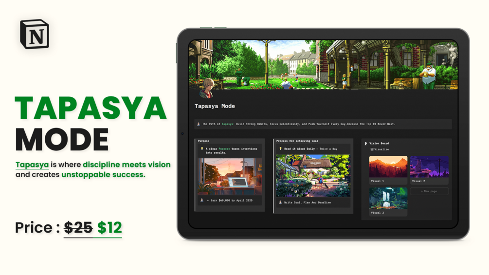 Discipline is the bridge between goals and achievements. Tapasya Mode isn’t just a Notion template—it’s your foundation for mastering your habits, sharpening your focus, and owning your time.